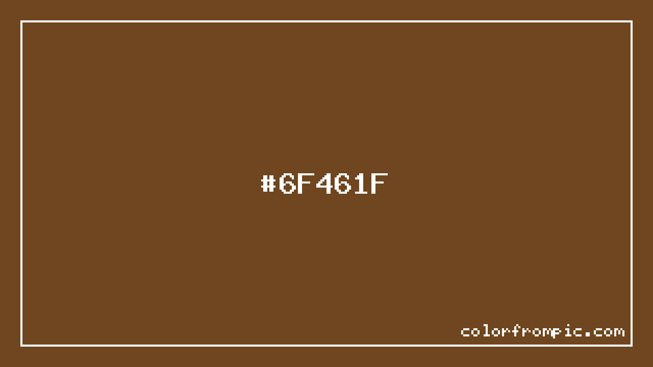 The hexadecimal color code #6F461F represents a dark shade in the red family. In the RGB color model, this color is composed of 111 red, 70 green, and 31 blue, which translates to approximately 44% red, 27% green, and 12% blue. This makes it a moderately saturated color with warm undertones that can evoke different emotional responses depending on its application.