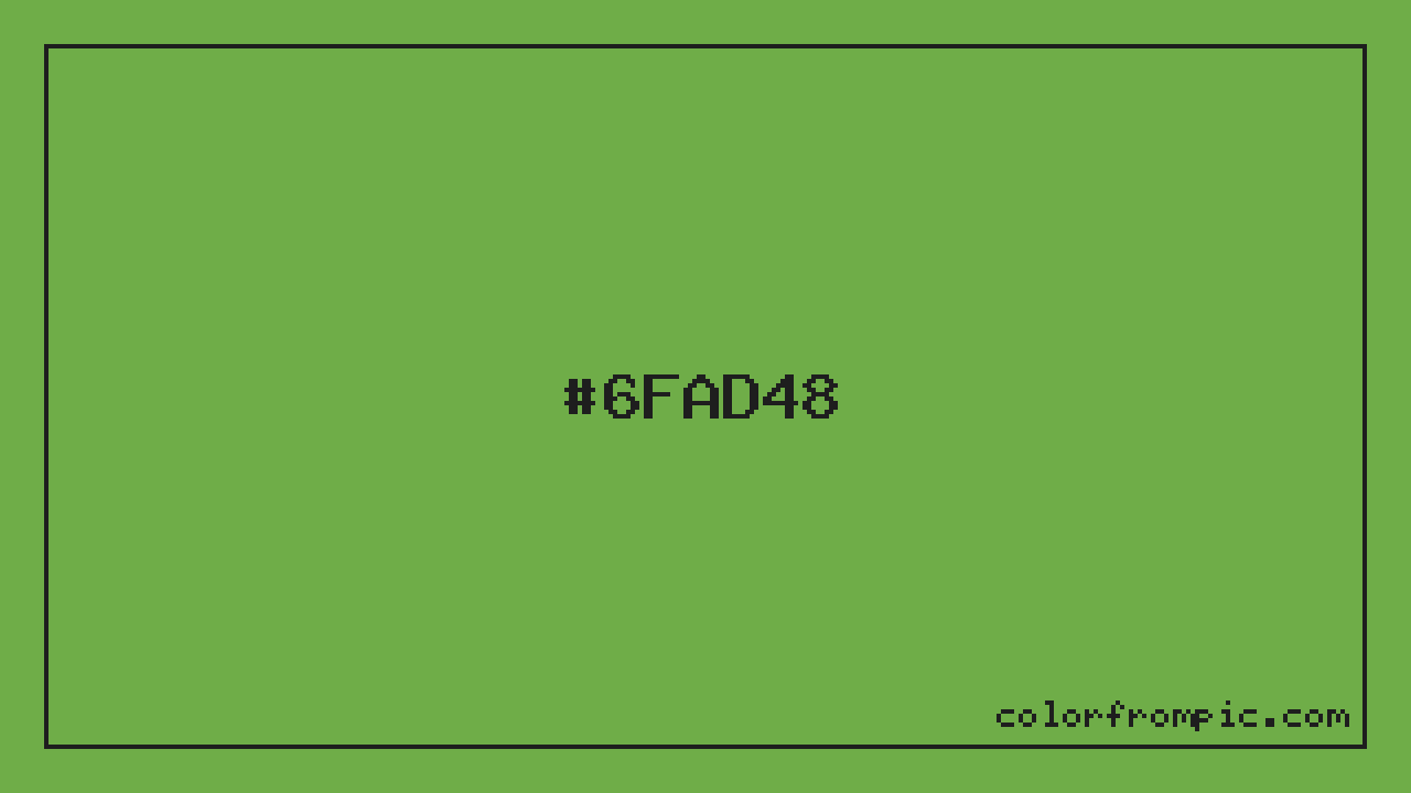 For print applications using the CMYK color model, #6FAD48 would be reproduced using 36% cyan, 0% magenta, 58% yellow, and 32% black. The closest web-safe color is #669933, which may be useful for ensuring compatibility across older displays and systems.