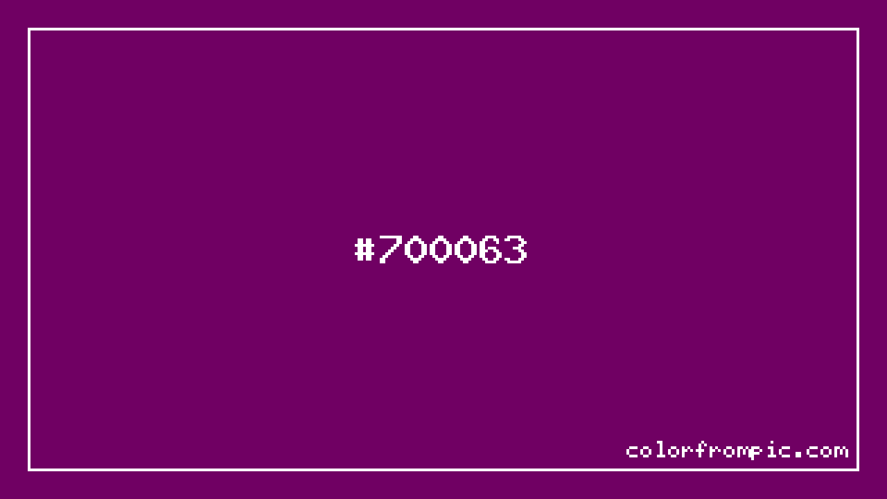 The hexadecimal color code #700063 represents a dark shade in the purple family. In the RGB color model, this color is composed of 112 red, 0 green, and 99 blue, which translates to approximately 44% red, 0% green, and 39% blue. This makes it a highly saturated color with warm undertones that can evoke different emotional responses depending on its application.