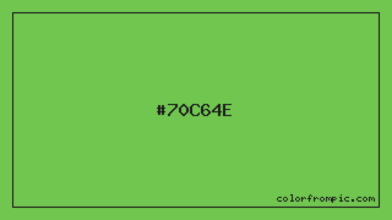 The hexadecimal color code #70C64E represents a medium shade in the green family. In the RGB color model, this color is composed of 112 red, 198 green, and 78 blue, which translates to approximately 44% red, 78% green, and 31% blue. This makes it a moderately saturated color with cool undertones that can evoke different emotional responses depending on its application.
