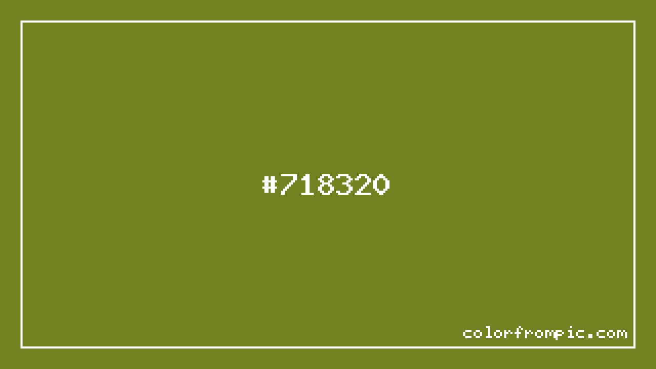For print applications using the CMYK color model, #718320 would be reproduced using 14% cyan, 0% magenta, 76% yellow, and 49% black. The closest web-safe color is #669933, which may be useful for ensuring compatibility across older displays and systems.