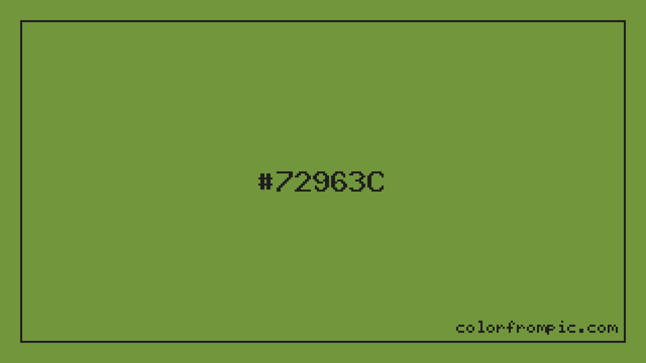 For print applications using the CMYK color model, #72963C would be reproduced using 24% cyan, 0% magenta, 60% yellow, and 41% black. The closest web-safe color is #669933, which may be useful for ensuring compatibility across older displays and systems.