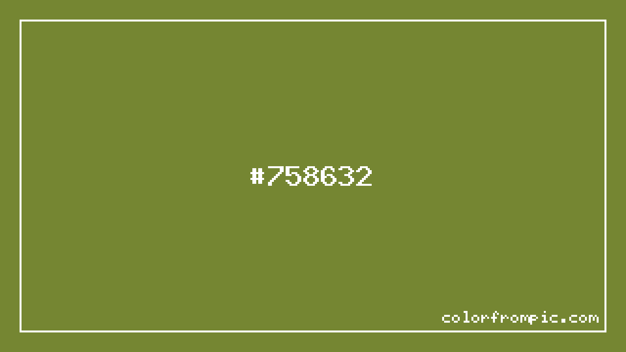 For print applications using the CMYK color model, #758632 would be reproduced using 13% cyan, 0% magenta, 63% yellow, and 47% black. The closest web-safe color is #669933, which may be useful for ensuring compatibility across older displays and systems.