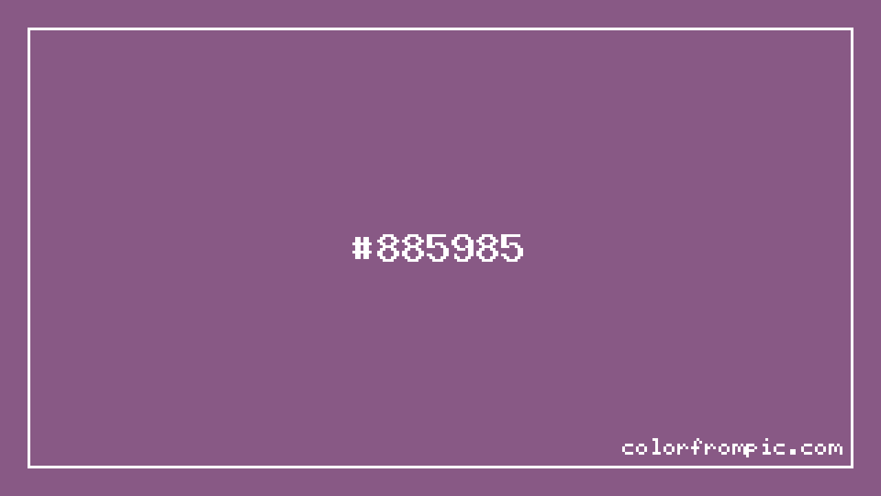 The HEX code for Muted Purple is #885985. In CSS you can use it directly as color: #885985; or as a background: background-color: #885985;. The three-character shorthand is not available for this color since it cannot be reduced without changing the value. Use the full six-character hex for accurate reproduction in any web or design project.