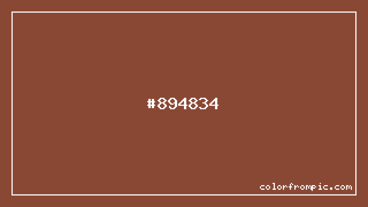 This color works well in various design contexts. With its medium lightness, it's versatile enough for both foreground elements and subtle backgrounds. The moderate to low saturation gives this color a sophisticated, muted quality that works well in professional and minimalist designs. When pairing #894834 with other colors, consider its complementary color at hue 194° for maximum contrast, or use analogous colors within 30° of its hue for harmonious combinations. The decimal representation of this color is 8996916, which can be useful in certain programming contexts.