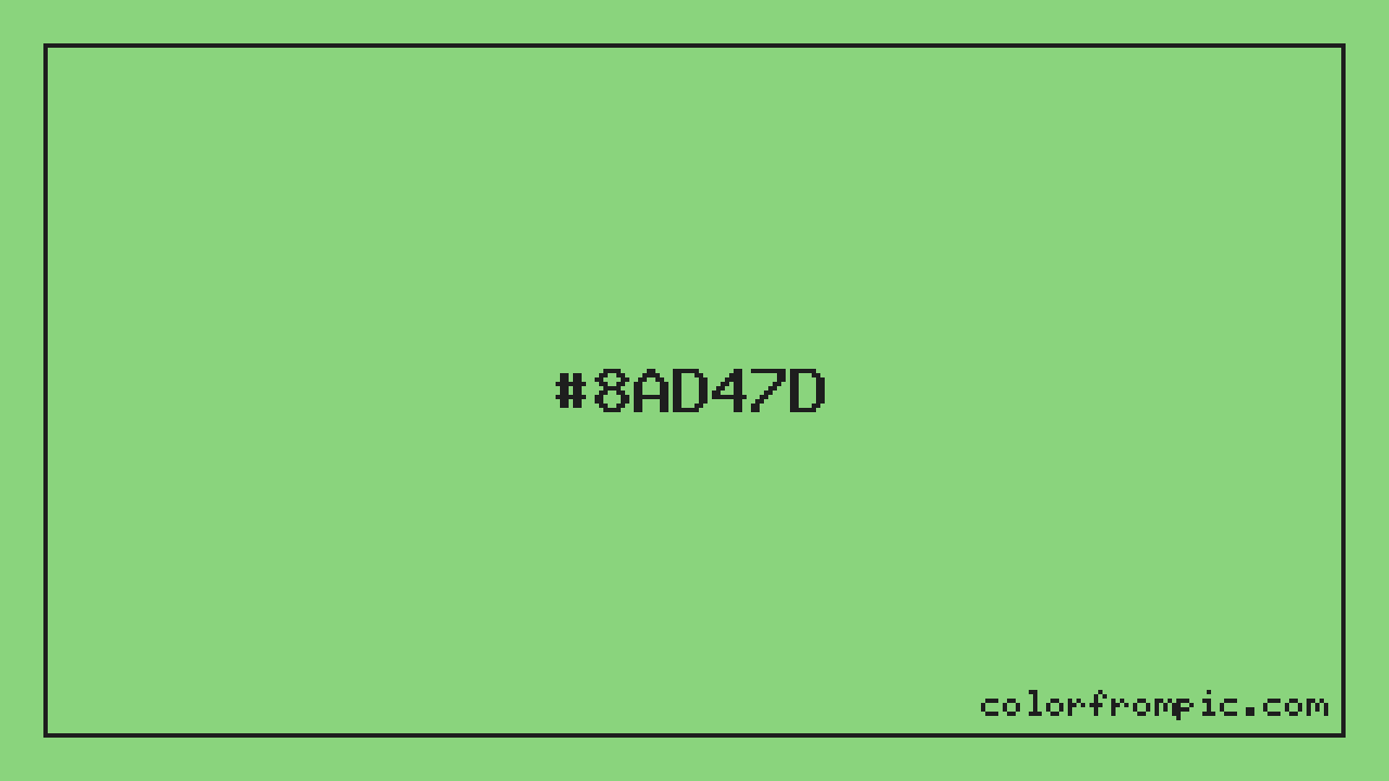 The HEX code for Soft Cool Green is #8AD47D. In CSS you can use it directly as color: #8AD47D; or as a background: background-color: #8AD47D;. The three-character shorthand is not available for this color since it cannot be reduced without changing the value. Use the full six-character hex for accurate reproduction in any web or design project.