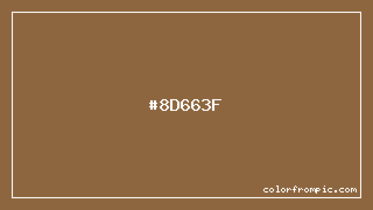 This color works well in various design contexts. With its medium lightness, it's versatile enough for both foreground elements and subtle backgrounds. The moderate to low saturation gives this color a sophisticated, muted quality that works well in professional and minimalist designs. When pairing #8D663F with other colors, consider its complementary color at hue 210° for maximum contrast, or use analogous colors within 30° of its hue for harmonious combinations. The decimal representation of this color is 9266751, which can be useful in certain programming contexts.
