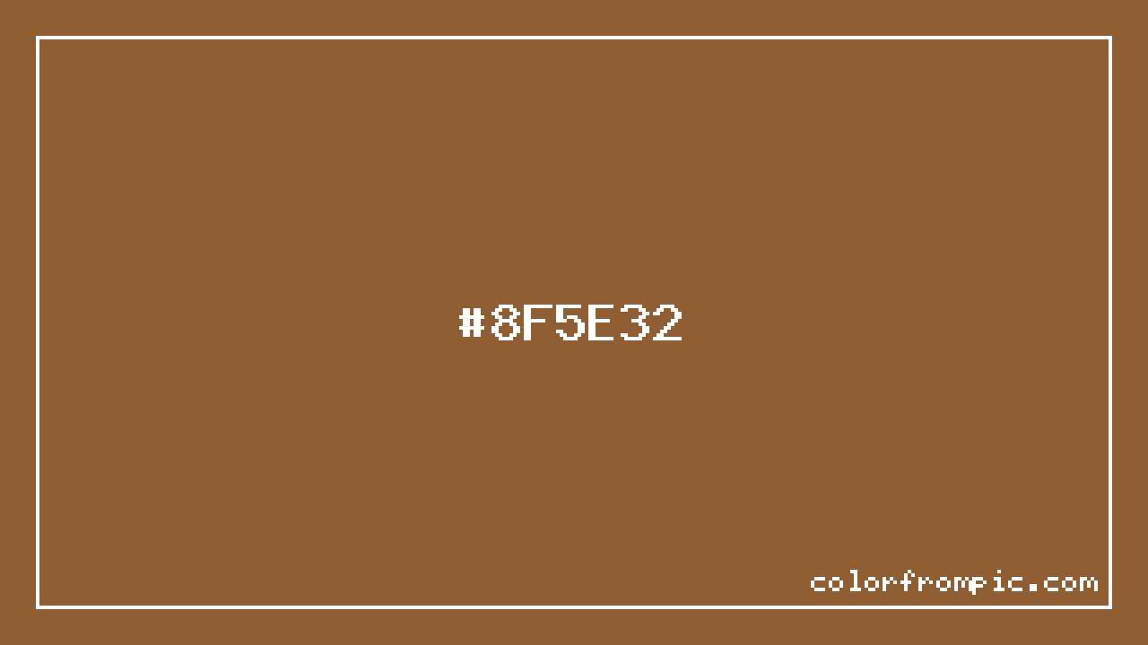 The HEX code for Dark Vermilion is #8F5E32. In CSS you can use it directly as color: #8F5E32; or as a background: background-color: #8F5E32;. The three-character shorthand is not available for this color since it cannot be reduced without changing the value. Use the full six-character hex for accurate reproduction in any web or design project.