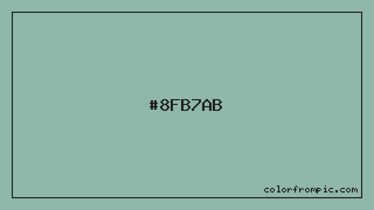 The HEX code for Soft Muted Teal is #8FB7AB. In CSS you can use it directly as color: #8FB7AB; or as a background: background-color: #8FB7AB;. The three-character shorthand is not available for this color since it cannot be reduced without changing the value. Use the full six-character hex for accurate reproduction in any web or design project.