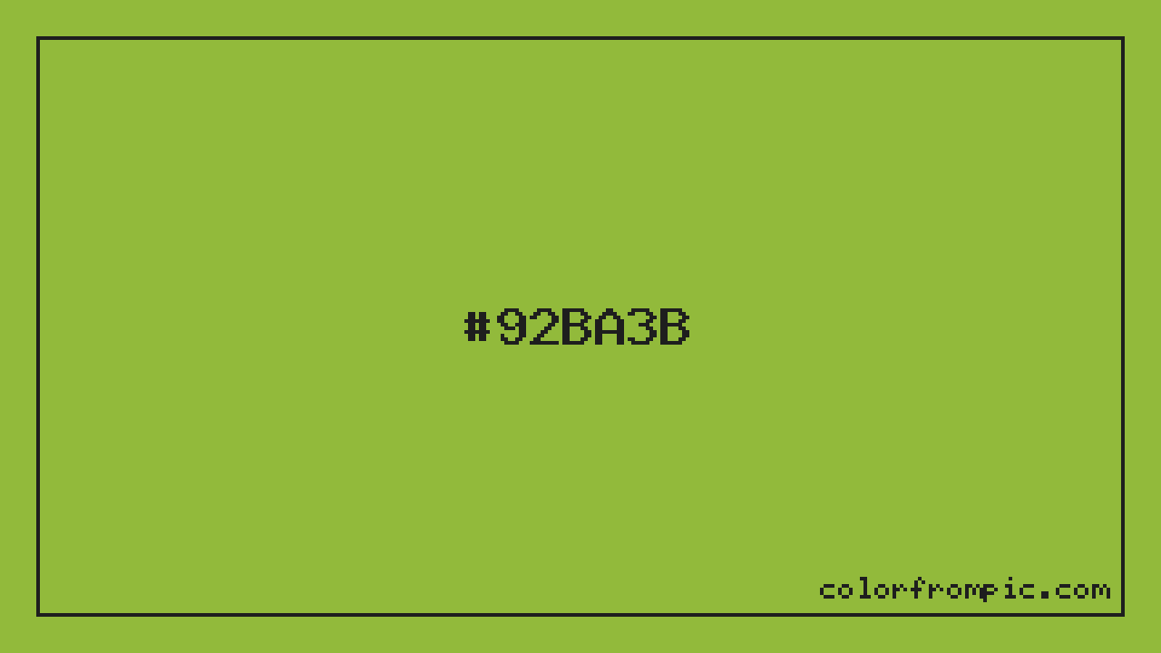 The hexadecimal color code #92BA3B represents a medium shade in the yellow family. In the RGB color model, this color is composed of 146 red, 186 green, and 59 blue, which translates to approximately 57% red, 73% green, and 23% blue. This makes it a moderately saturated color with cool undertones that can evoke different emotional responses depending on its application.