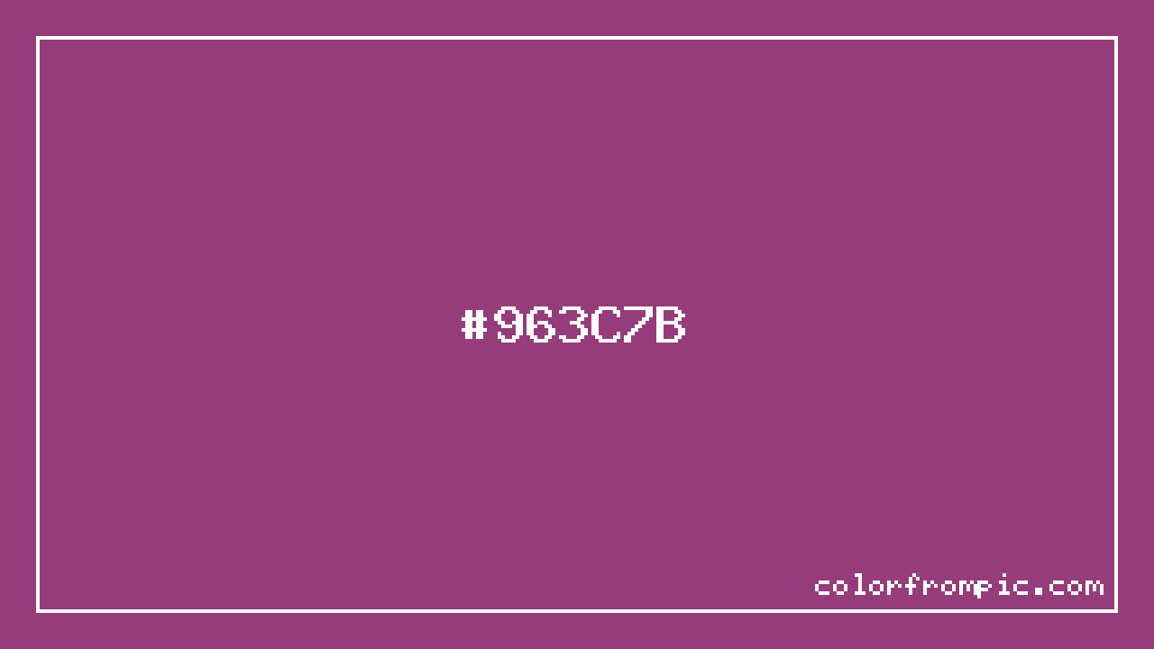 The HEX code for Magenta is #963C7B. In CSS you can use it directly as color: #963C7B; or as a background: background-color: #963C7B;. The three-character shorthand is not available for this color since it cannot be reduced without changing the value. Use the full six-character hex for accurate reproduction in any web or design project.