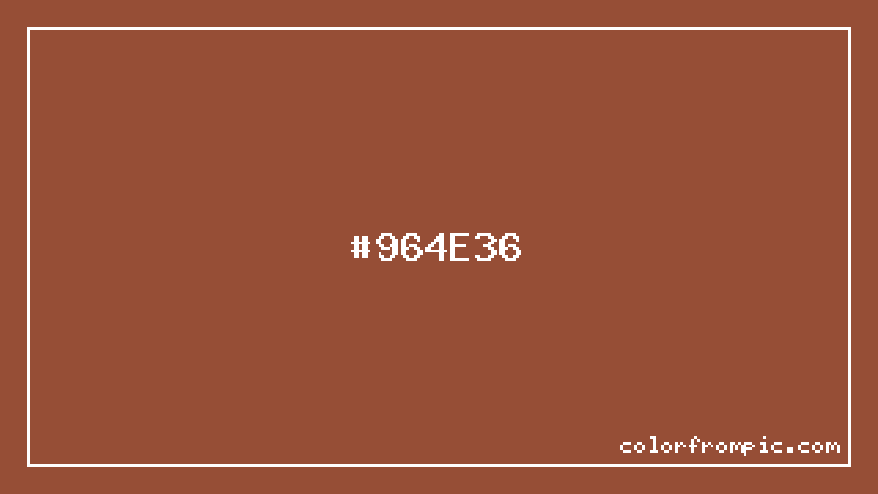This color works well in various design contexts. With its medium lightness, it's versatile enough for both foreground elements and subtle backgrounds. The moderate to low saturation gives this color a sophisticated, muted quality that works well in professional and minimalist designs. When pairing #964E36 with other colors, consider its complementary color at hue 195° for maximum contrast, or use analogous colors within 30° of its hue for harmonious combinations. The decimal representation of this color is 9850422, which can be useful in certain programming contexts.