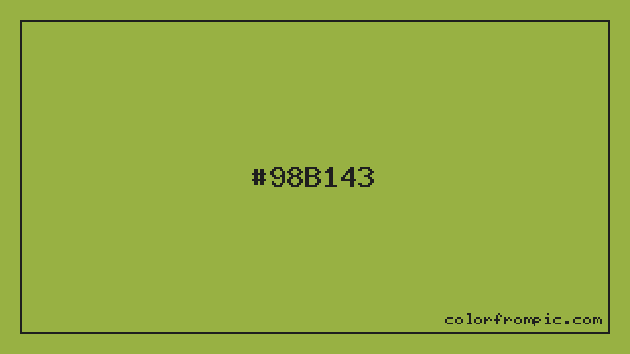 For print applications using the CMYK color model, #98B143 would be reproduced using 14% cyan, 0% magenta, 62% yellow, and 31% black. The closest web-safe color is #999933, which may be useful for ensuring compatibility across older displays and systems.