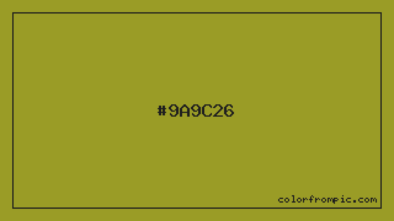 The hexadecimal color code #9A9C26 represents a dark shade in the yellow family. In the RGB color model, this color is composed of 154 red, 156 green, and 38 blue, which translates to approximately 60% red, 61% green, and 15% blue. This makes it a moderately saturated color with cool undertones that can evoke different emotional responses depending on its application.