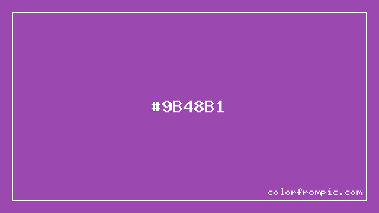 The HEX code for Purple is #9B48B1. In CSS you can use it directly as color: #9B48B1; or as a background: background-color: #9B48B1;. The three-character shorthand is not available for this color since it cannot be reduced without changing the value. Use the full six-character hex for accurate reproduction in any web or design project.