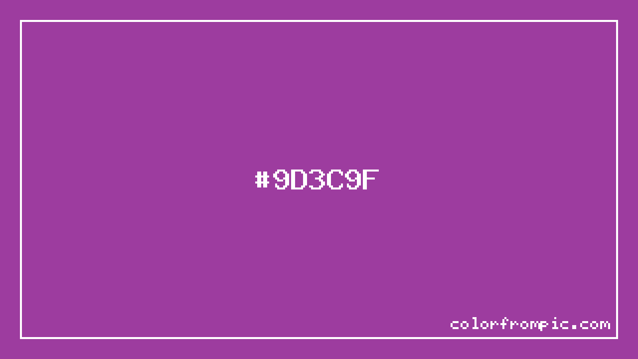 This color works well in various design contexts. With its medium lightness, it's versatile enough for both foreground elements and subtle backgrounds. The moderate to low saturation gives this color a sophisticated, muted quality that works well in professional and minimalist designs. When pairing #9D3C9F with other colors, consider its complementary color at hue 119° for maximum contrast, or use analogous colors within 30° of its hue for harmonious combinations. The decimal representation of this color is 10304671, which can be useful in certain programming contexts.