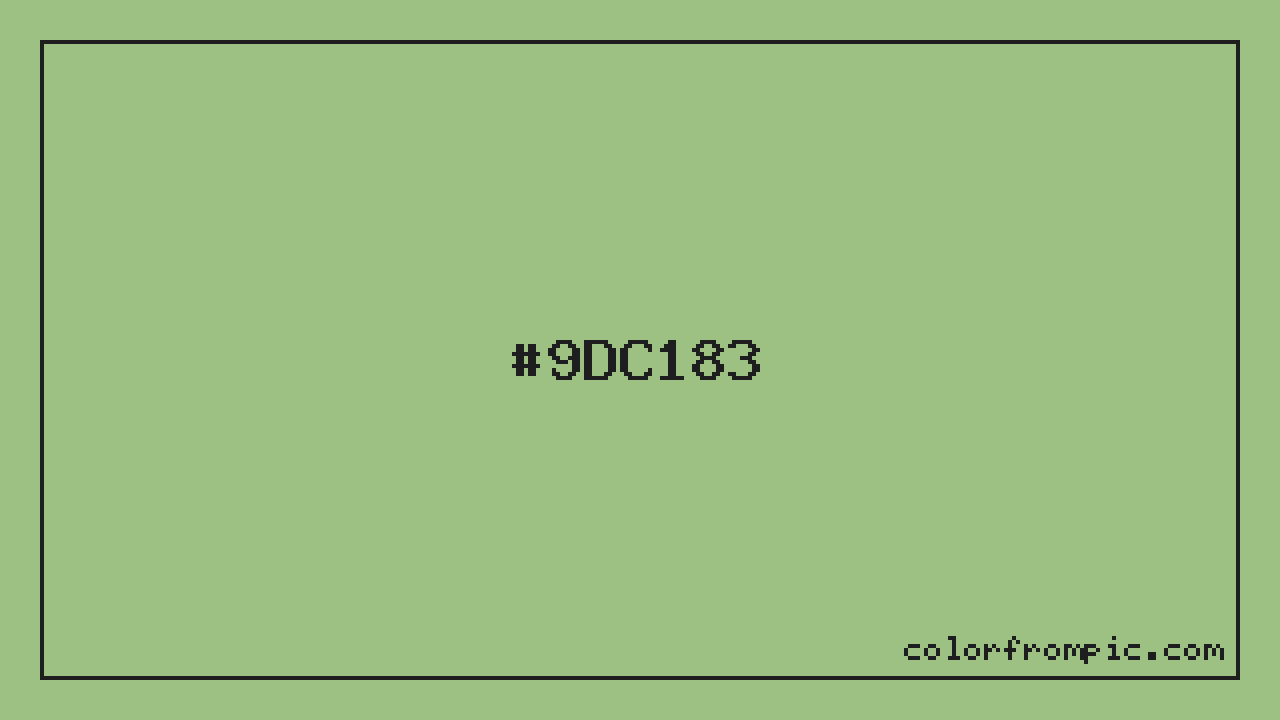 The hexadecimal color code #9DC183 represents a light shade in the green family. In the RGB color model, this color is composed of 157 red, 193 green, and 131 blue, which translates to approximately 62% red, 76% green, and 51% blue. This makes it a slightly desaturated color with cool undertones that can evoke different emotional responses depending on its application. When analyzed in the HSL (Hue, Saturation, Lightness) color space, #9DC183 has a hue of 95 degrees, a saturation level of 33%, and a lightness value of 64%. The hue angle of places this color firmly in the green spectrum. In the HSV/HSB color model, this translates to a hue of , saturation of 32%, and brightness/value of 76%. For print applications using the CMYK color model, #9DC183 would be reproduced using 19% cyan, 0% magenta, 32% yellow, and 24% black. The closest web-safe color is #99CC99, which may be useful for ensuring compatibility across older displays and systems. This color works well in various design contexts. With its medium lightness, it's versatile enough for both foreground elements and subtle backgrounds. The moderate to low saturation gives this color a sophisticated, muted quality that works well in professional and minimalist designs. When pairing #9DC183 with other colors, consider its complementary color at hue 275° for maximum contrast, or use analogous colors within 30° of its hue for harmonious combinations. The decimal representation of this color is 10338691, which can be useful in certain programming contexts.