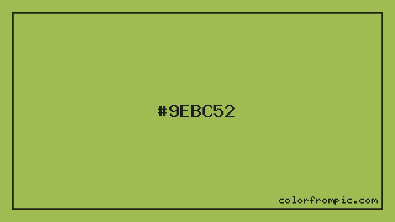 The hexadecimal color code #9EBC52 represents a medium shade in the yellow family. In the RGB color model, this color is composed of 158 red, 188 green, and 82 blue, which translates to approximately 62% red, 74% green, and 32% blue. This makes it a slightly desaturated color with cool undertones that can evoke different emotional responses depending on its application.