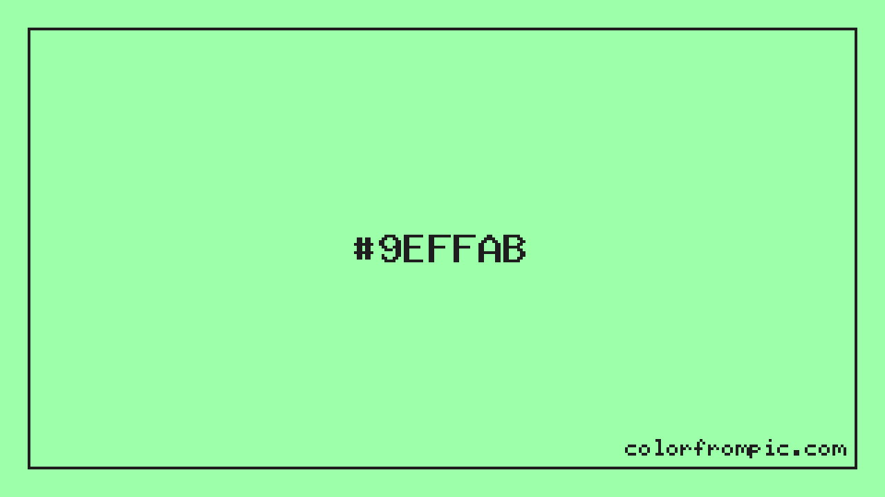 The HEX code for Light Vivid Emerald is #9EFFAB. In CSS you can use it directly as color: #9EFFAB; or as a background: background-color: #9EFFAB;. The three-character shorthand is not available for this color since it cannot be reduced without changing the value. Use the full six-character hex for accurate reproduction in any web or design project.