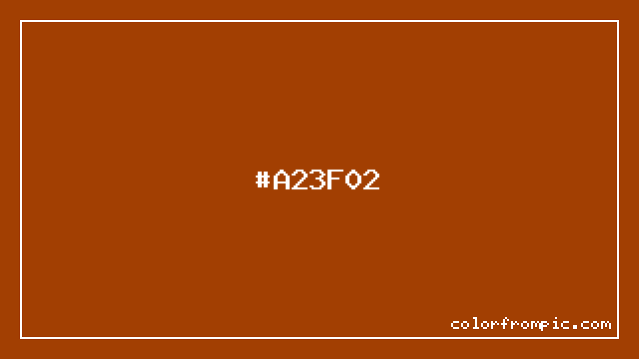 The hexadecimal color code #A23F02 represents a dark shade in the red family. In the RGB color model, this color is composed of 162 red, 63 green, and 2 blue, which translates to approximately 64% red, 25% green, and 1% blue. This makes it a highly saturated color with warm undertones that can evoke different emotional responses depending on its application.