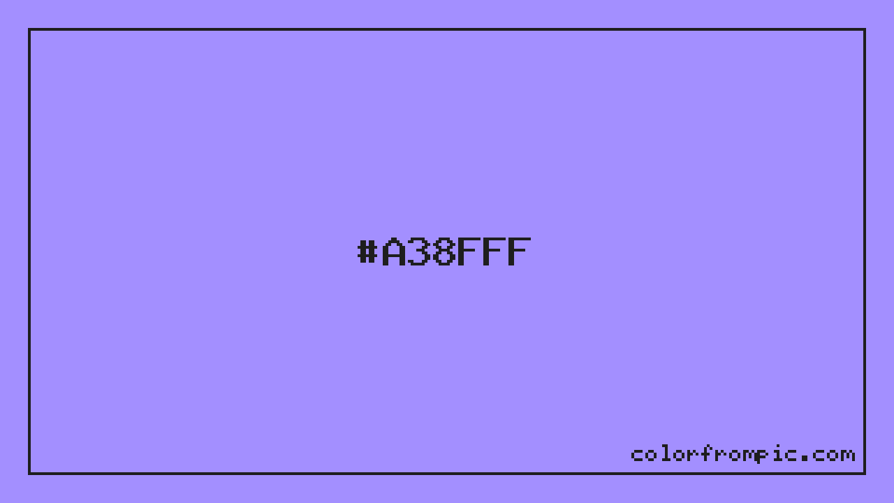 The HEX code for Light Vivid Violet is #A38FFF. In CSS you can use it directly as color: #A38FFF; or as a background: background-color: #A38FFF;. The three-character shorthand is not available for this color since it cannot be reduced without changing the value. Use the full six-character hex for accurate reproduction in any web or design project.