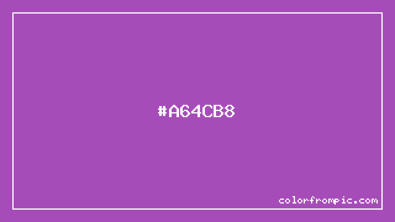 The HEX code for Purple is #A64CB8. In CSS you can use it directly as color: #A64CB8; or as a background: background-color: #A64CB8;. The three-character shorthand is not available for this color since it cannot be reduced without changing the value. Use the full six-character hex for accurate reproduction in any web or design project.