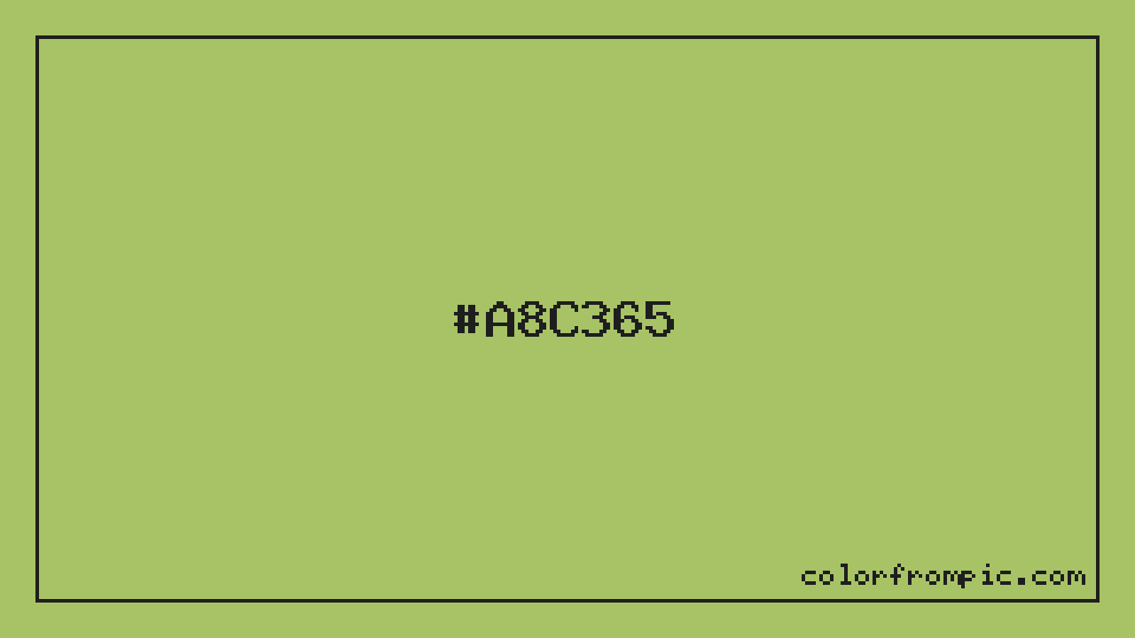 The hexadecimal color code #A8C365 represents a medium shade in the yellow family. In the RGB color model, this color is composed of 168 red, 195 green, and 101 blue, which translates to approximately 66% red, 76% green, and 40% blue. This makes it a slightly desaturated color with cool undertones that can evoke different emotional responses depending on its application.