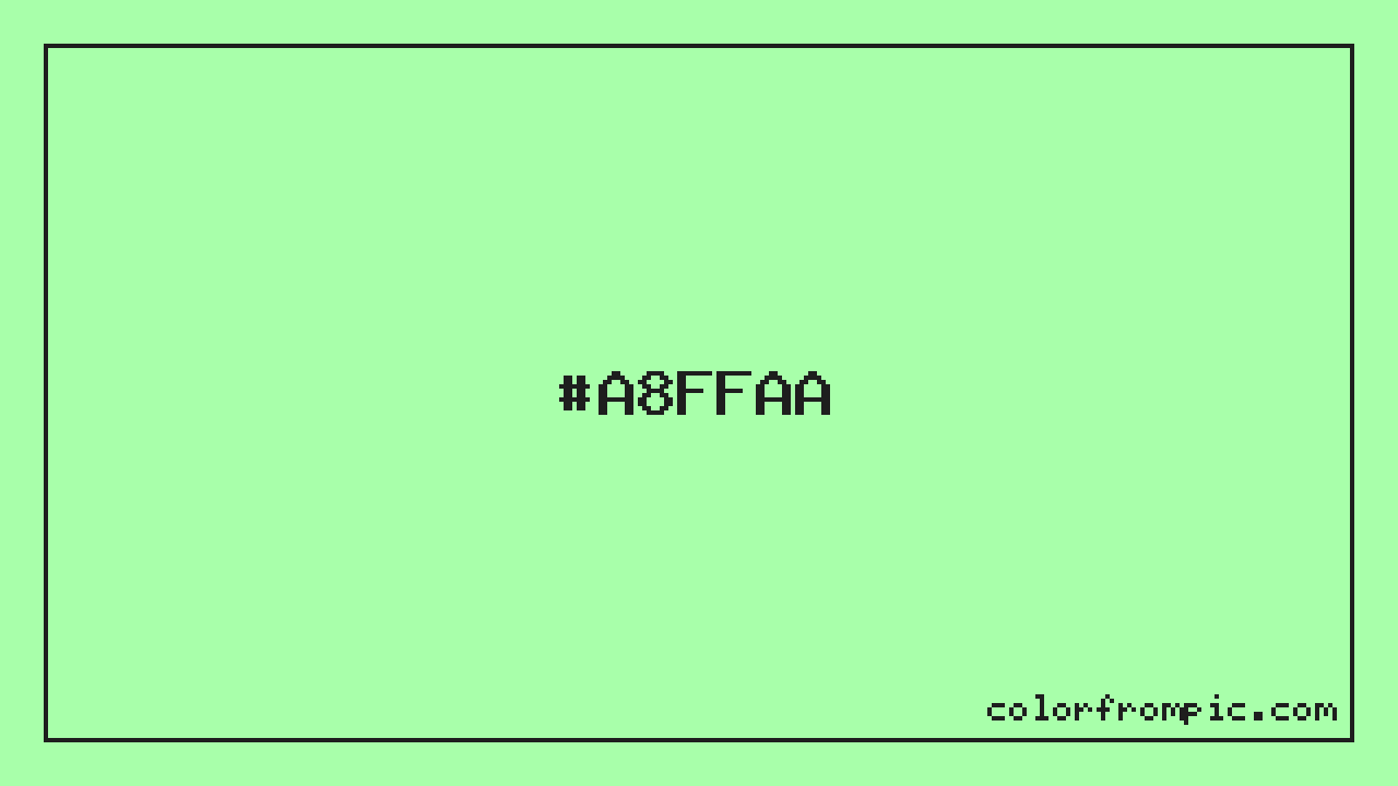 The approximate CMYK value of #A8FFAA is C:34% M:0% Y:33% K:0%. CMYK (Cyan, Magenta, Yellow, Key/Black) is the color model used in physical printing. Unlike RGB which mixes light additively on screens, CMYK mixes inks subtractively on paper. Note that the RGB-to-CMYK conversion is an approximation — screen colors and print colors exist in different color gamuts, and some screen colors cannot be exactly reproduced in print. For precise print work, consult a professional print color profile or Pantone matching system.