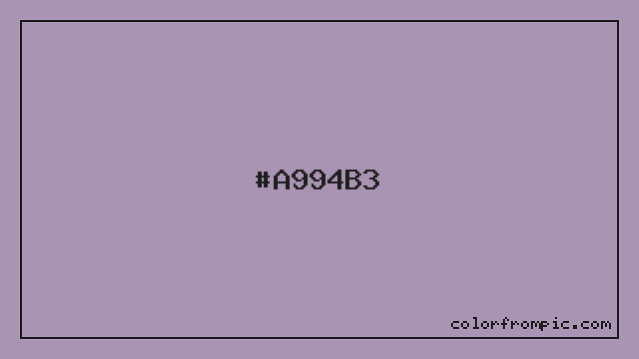 The hexadecimal color code #A994B3 represents a light shade in the purple family. In the RGB color model, this color is composed of 169 red, 148 green, and 179 blue, which translates to approximately 66% red, 58% green, and 70% blue. This makes it a nearly neutral color with cool undertones that can evoke different emotional responses depending on its application.