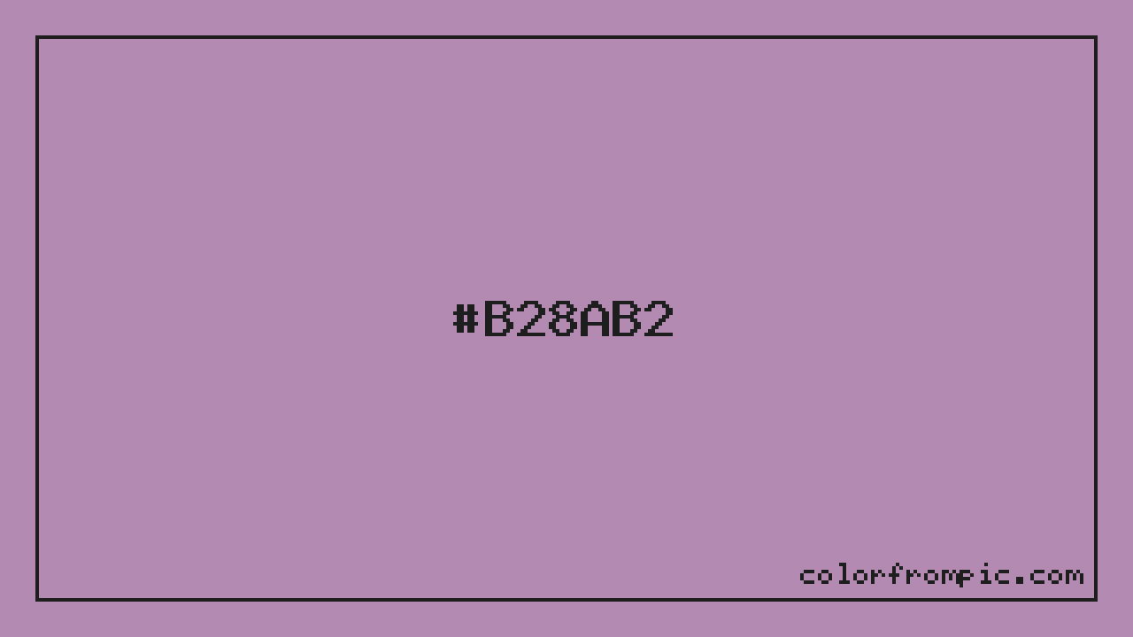 The HEX code for Soft Muted Purple is #B28AB2. In CSS you can use it directly as color: #B28AB2; or as a background: background-color: #B28AB2;. The three-character shorthand is not available for this color since it cannot be reduced without changing the value. Use the full six-character hex for accurate reproduction in any web or design project.