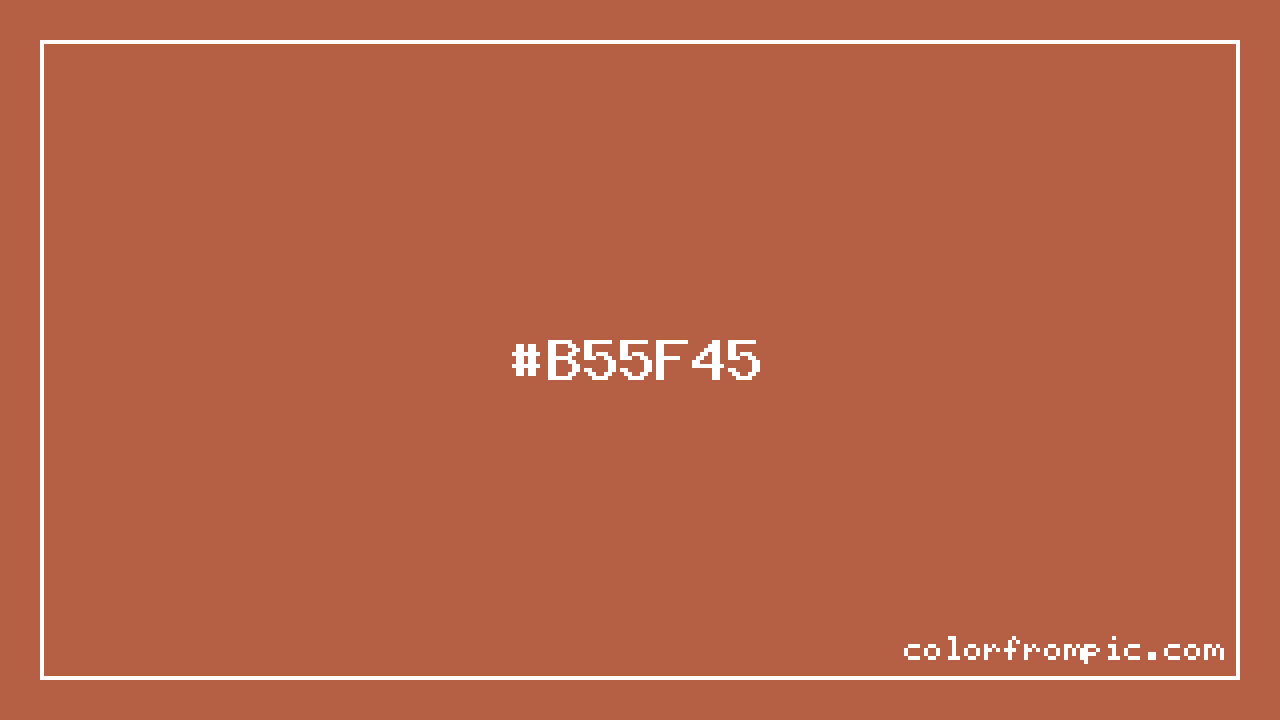 The hexadecimal color code #B55F45 represents a medium shade in the red family. In the RGB color model, this color is composed of 181 red, 95 green, and 69 blue, which translates to approximately 71% red, 37% green, and 27% blue. This makes it a slightly desaturated color with warm undertones that can evoke different emotional responses depending on its application.