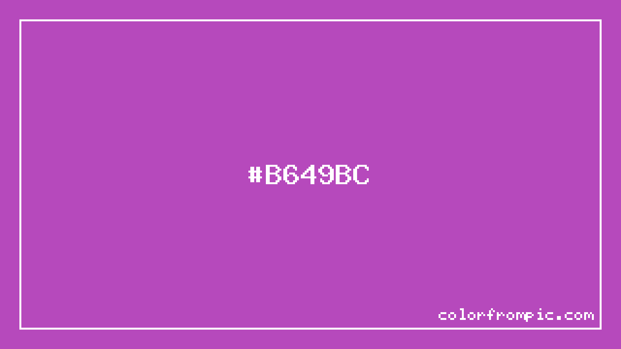 The HEX code for Purple is #B649BC. In CSS you can use it directly as color: #B649BC; or as a background: background-color: #B649BC;. The three-character shorthand is not available for this color since it cannot be reduced without changing the value. Use the full six-character hex for accurate reproduction in any web or design project.