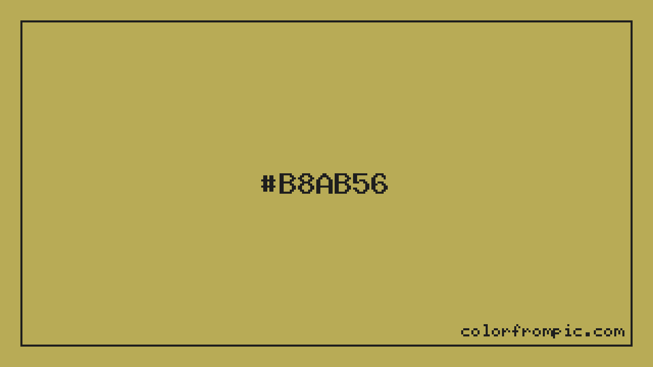 This color works well in various design contexts. With its medium lightness, it's versatile enough for both foreground elements and subtle backgrounds. The moderate to low saturation gives this color a sophisticated, muted quality that works well in professional and minimalist designs. When pairing #B8AB56 with other colors, consider its complementary color at hue 232° for maximum contrast, or use analogous colors within 30° of its hue for harmonious combinations. The decimal representation of this color is 12102486, which can be useful in certain programming contexts.