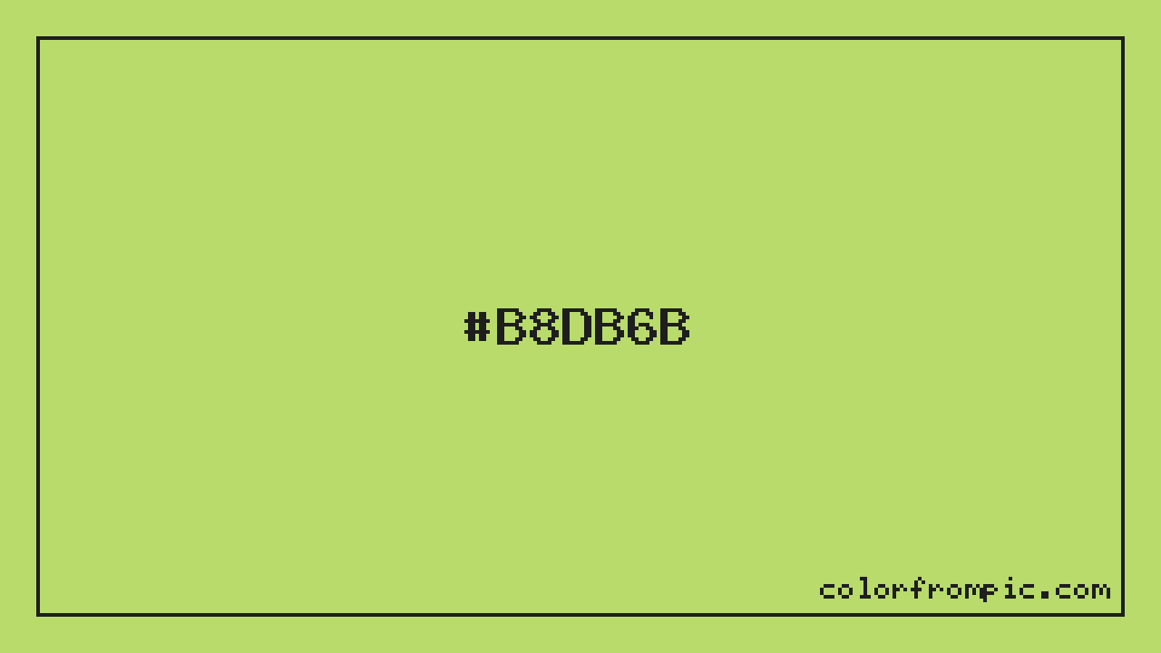 The hexadecimal color code #B8DB6B represents a light shade in the yellow family. In the RGB color model, this color is composed of 184 red, 219 green, and 107 blue, which translates to approximately 72% red, 86% green, and 42% blue. This makes it a moderately saturated color with cool undertones that can evoke different emotional responses depending on its application.