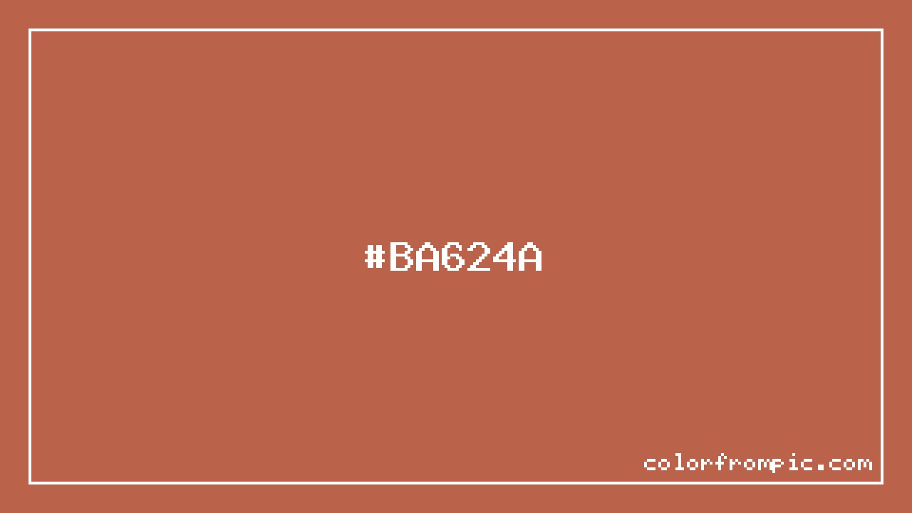 This color works well in various design contexts. With its medium lightness, it's versatile enough for both foreground elements and subtle backgrounds. The moderate to low saturation gives this color a sophisticated, muted quality that works well in professional and minimalist designs. When pairing #BA624A with other colors, consider its complementary color at hue 193° for maximum contrast, or use analogous colors within 30° of its hue for harmonious combinations. The decimal representation of this color is 12214858, which can be useful in certain programming contexts.
