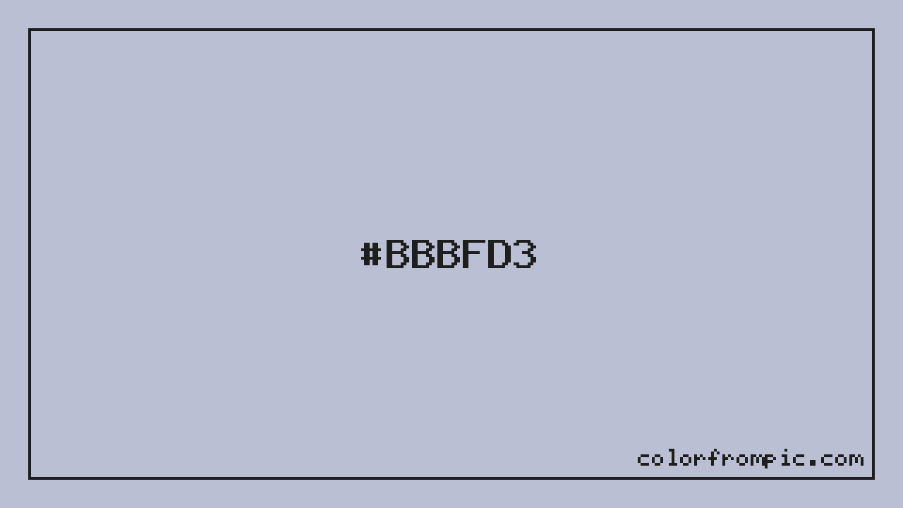 The HEX code for Light Muted Blue is #BBBFD3. In CSS you can use it directly as color: #BBBFD3; or as a background: background-color: #BBBFD3;. The three-character shorthand is not available for this color since it cannot be reduced without changing the value. Use the full six-character hex for accurate reproduction in any web or design project.
