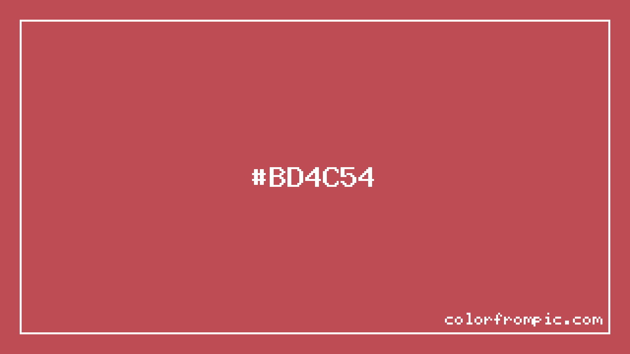 This color works well in various design contexts. With its medium lightness, it's versatile enough for both foreground elements and subtle backgrounds. The moderate to low saturation gives this color a sophisticated, muted quality that works well in professional and minimalist designs. When pairing #BD4C54 with other colors, consider its complementary color at hue 176° for maximum contrast, or use analogous colors within 30° of its hue for harmonious combinations. The decimal representation of this color is 12405844, which can be useful in certain programming contexts.