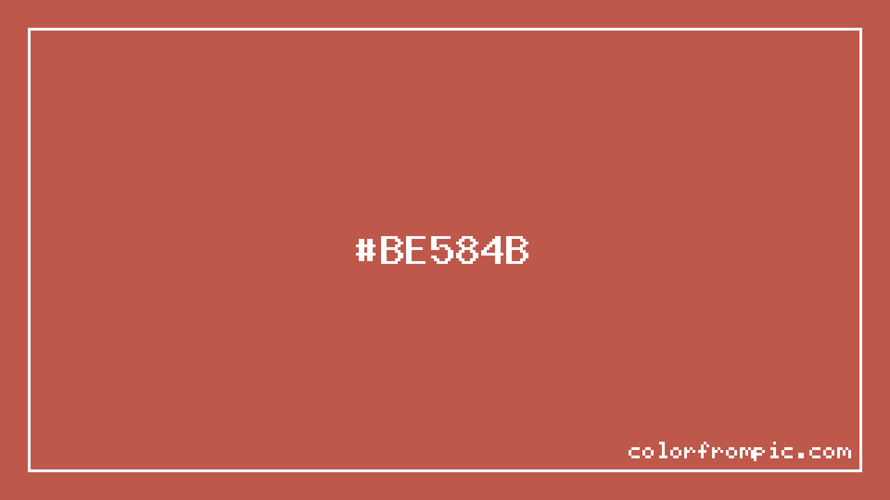 This color works well in various design contexts. With its medium lightness, it's versatile enough for both foreground elements and subtle backgrounds. The moderate to low saturation gives this color a sophisticated, muted quality that works well in professional and minimalist designs. When pairing #BE584B with other colors, consider its complementary color at hue 187° for maximum contrast, or use analogous colors within 30° of its hue for harmonious combinations. The decimal representation of this color is 12474443, which can be useful in certain programming contexts.
