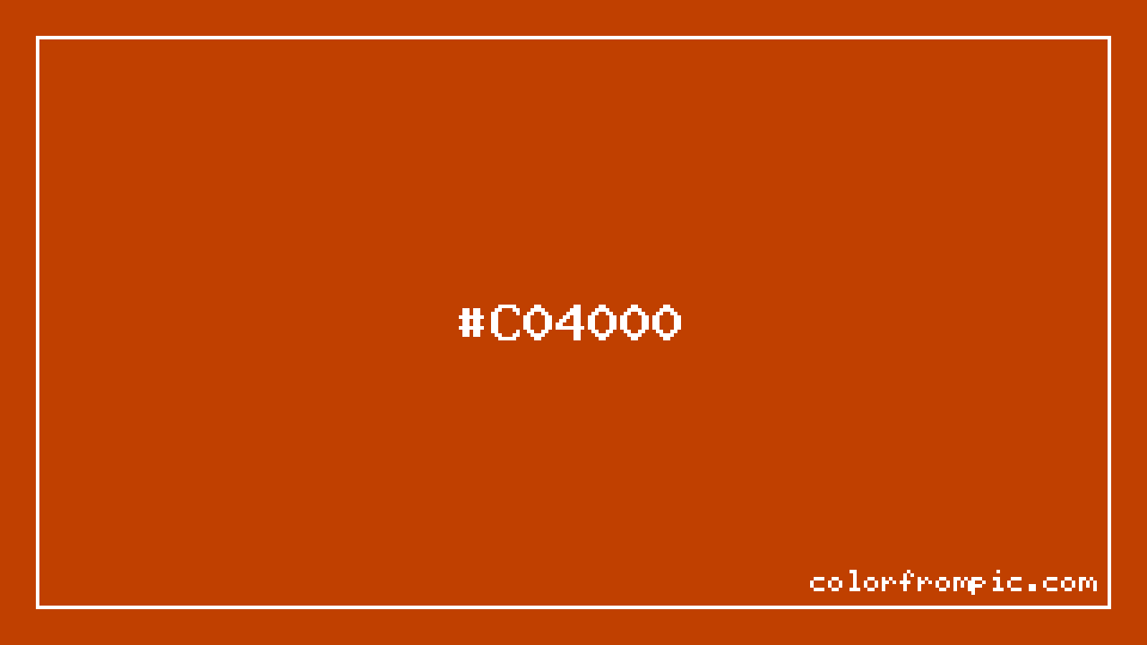The hexadecimal color code #C04000 represents a dark shade in the red family. In the RGB color model, this color is composed of 192 red, 64 green, and 0 blue, which translates to approximately 75% red, 25% green, and 0% blue. This makes it a highly saturated color with warm undertones that can evoke different emotional responses depending on its application. When analyzed in the HSL (Hue, Saturation, Lightness) color space, #C04000 has a hue of 20 degrees, a saturation level of 100%, and a lightness value of 38%. The hue angle of places this color firmly in the red spectrum. In the HSV/HSB color model, this translates to a hue of , saturation of 100%, and brightness/value of 75%. For print applications using the CMYK color model, #C04000 would be reproduced using 0% cyan, 67% magenta, 100% yellow, and 25% black. The closest web-safe color is #CC3300, which may be useful for ensuring compatibility across older displays and systems. This color works well in various design contexts. With its medium lightness, it's versatile enough for both foreground elements and subtle backgrounds. The high saturation makes this color vibrant and attention-grabbing, ideal for call-to-action buttons, highlights, and accent elements. When pairing #C04000 with other colors, consider its complementary color at hue 200° for maximum contrast, or use analogous colors within 30° of its hue for harmonious combinations. The decimal representation of this color is 12599296, which can be useful in certain programming contexts.