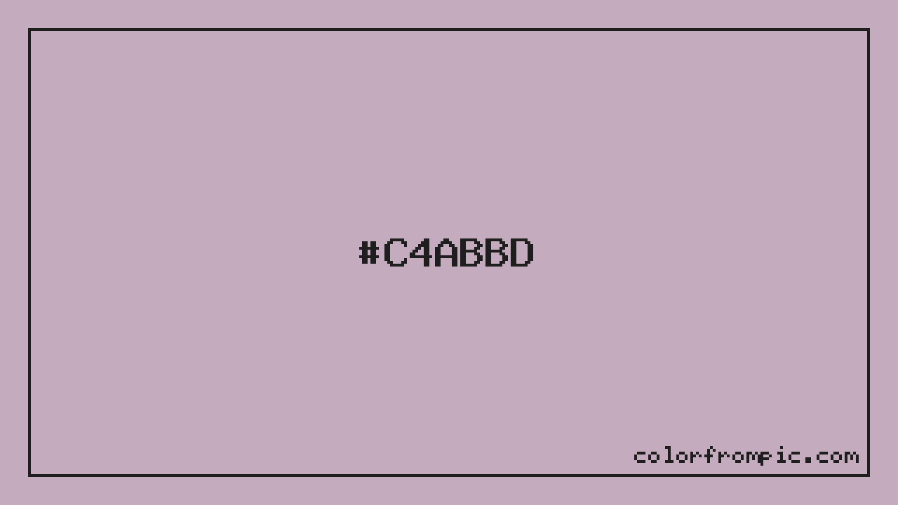 The approximate CMYK value of #C4ABBD is C:0% M:13% Y:4% K:23%. CMYK (Cyan, Magenta, Yellow, Key/Black) is the color model used in physical printing. Unlike RGB which mixes light additively on screens, CMYK mixes inks subtractively on paper. Note that the RGB-to-CMYK conversion is an approximation — screen colors and print colors exist in different color gamuts, and some screen colors cannot be exactly reproduced in print. For precise print work, consult a professional print color profile or Pantone matching system.