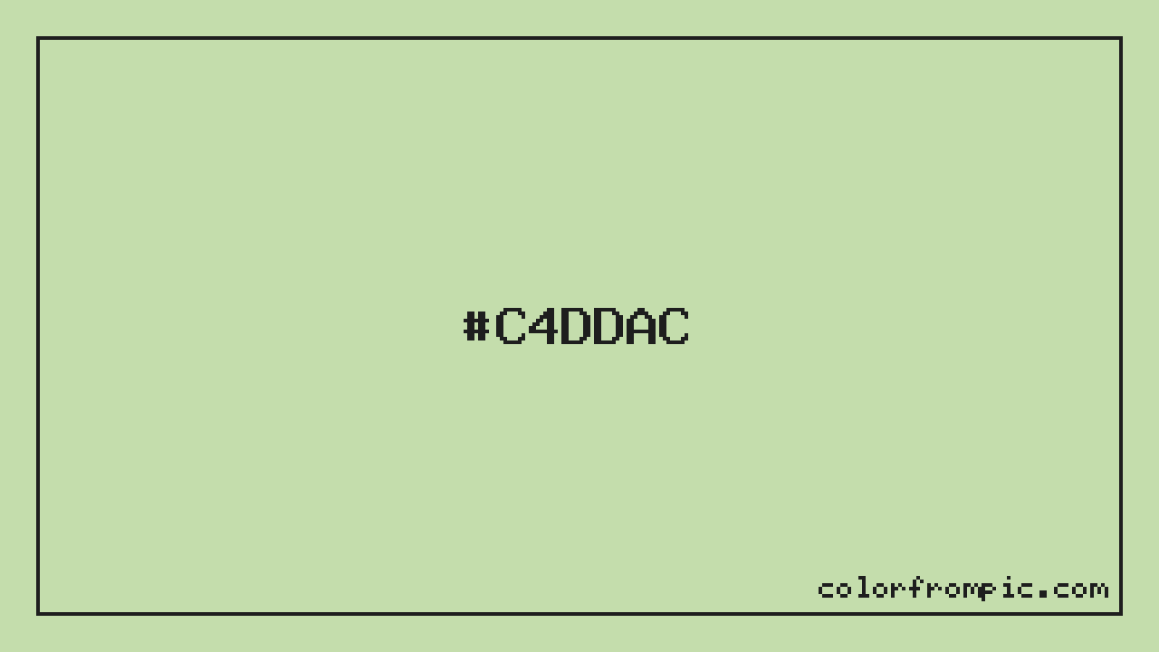 The approximate CMYK value of #C4DDAC is C:11% M:0% Y:22% K:13%. CMYK (Cyan, Magenta, Yellow, Key/Black) is the color model used in physical printing. Unlike RGB which mixes light additively on screens, CMYK mixes inks subtractively on paper. Note that the RGB-to-CMYK conversion is an approximation — screen colors and print colors exist in different color gamuts, and some screen colors cannot be exactly reproduced in print. For precise print work, consult a professional print color profile or Pantone matching system.