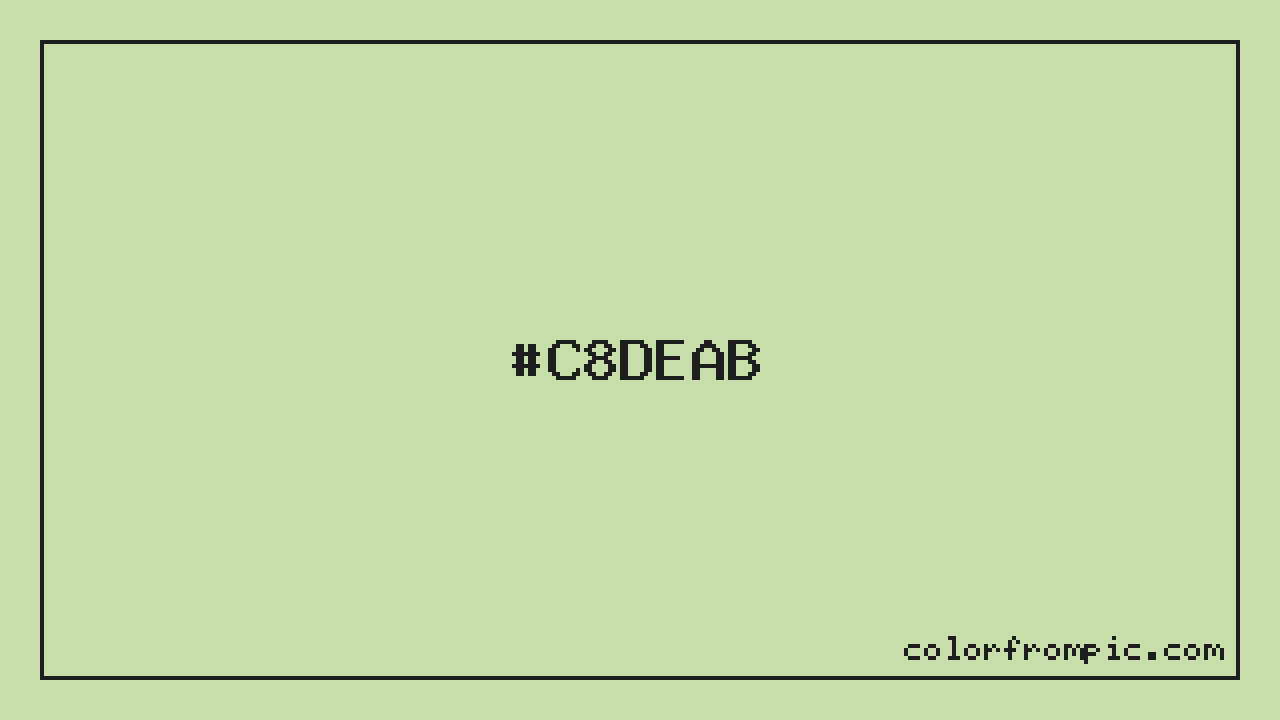 For print applications using the CMYK color model, #C8DEAB would be reproduced using 10% cyan, 0% magenta, 23% yellow, and 13% black. The closest web-safe color is #CCCC99, which may be useful for ensuring compatibility across older displays and systems.