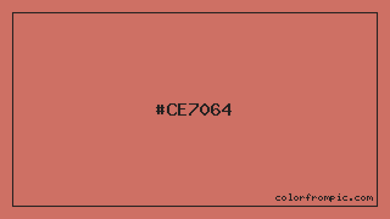 The hexadecimal color code #CE7064 represents a medium shade in the red family. In the RGB color model, this color is composed of 206 red, 112 green, and 100 blue, which translates to approximately 81% red, 44% green, and 39% blue. This makes it a moderately saturated color with warm undertones that can evoke different emotional responses depending on its application.