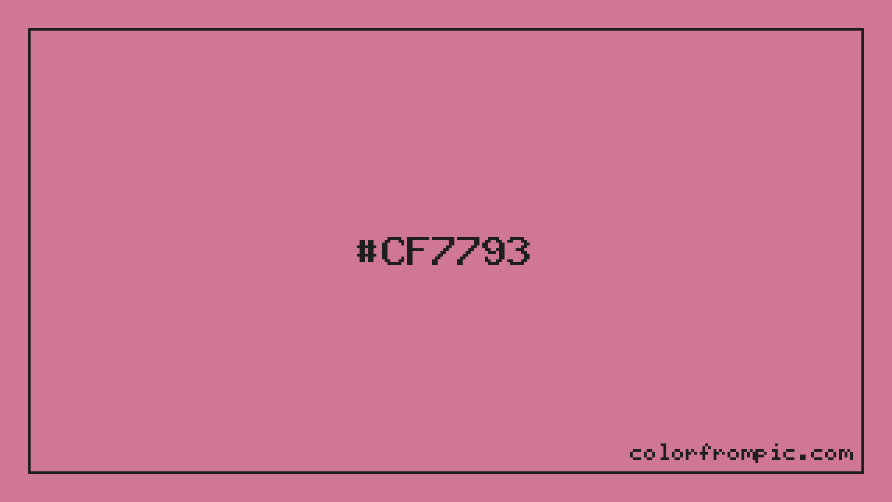 This color works well in various design contexts. With its medium lightness, it's versatile enough for both foreground elements and subtle backgrounds. The moderate to low saturation gives this color a sophisticated, muted quality that works well in professional and minimalist designs. When pairing #CF7793 with other colors, consider its complementary color at hue 161° for maximum contrast, or use analogous colors within 30° of its hue for harmonious combinations. The decimal representation of this color is 13596563, which can be useful in certain programming contexts.