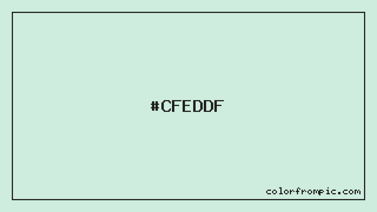 The approximate CMYK value of #CFEDDF is C:13% M:0% Y:6% K:7%. CMYK (Cyan, Magenta, Yellow, Key/Black) is the color model used in physical printing. Unlike RGB which mixes light additively on screens, CMYK mixes inks subtractively on paper. Note that the RGB-to-CMYK conversion is an approximation — screen colors and print colors exist in different color gamuts, and some screen colors cannot be exactly reproduced in print. For precise print work, consult a professional print color profile or Pantone matching system.