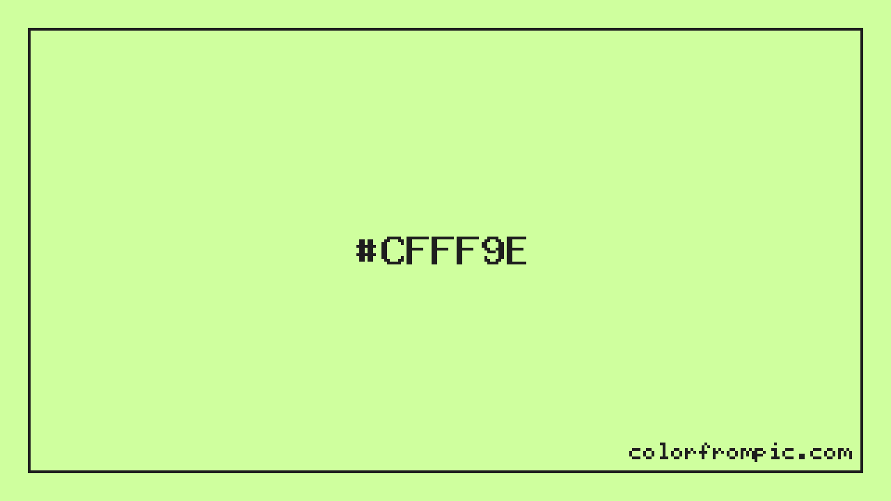 The HEX code for Light Vivid Green is #CFFF9E. In CSS you can use it directly as color: #CFFF9E; or as a background: background-color: #CFFF9E;. The three-character shorthand is not available for this color since it cannot be reduced without changing the value. Use the full six-character hex for accurate reproduction in any web or design project.