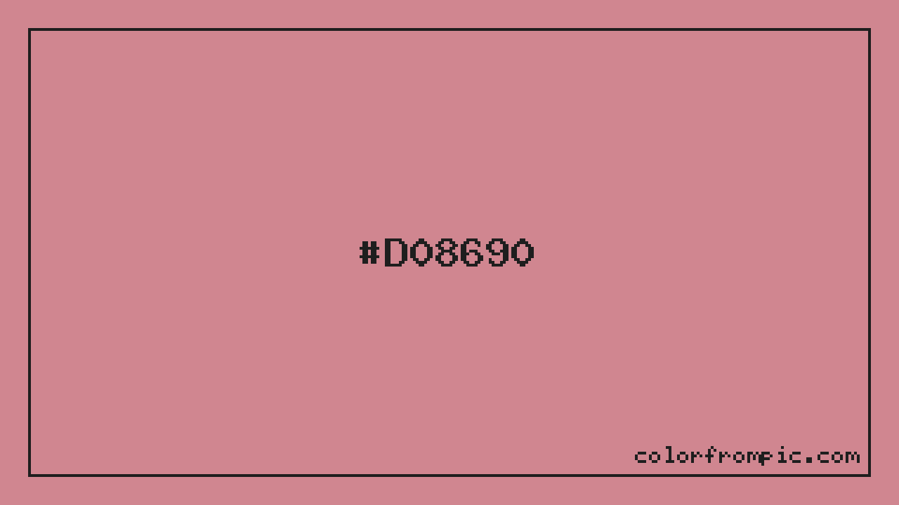 The approximate CMYK value of #D08690 is C:0% M:36% Y:31% K:18%. CMYK (Cyan, Magenta, Yellow, Key/Black) is the color model used in physical printing. Unlike RGB which mixes light additively on screens, CMYK mixes inks subtractively on paper. Note that the RGB-to-CMYK conversion is an approximation — screen colors and print colors exist in different color gamuts, and some screen colors cannot be exactly reproduced in print. For precise print work, consult a professional print color profile or Pantone matching system.