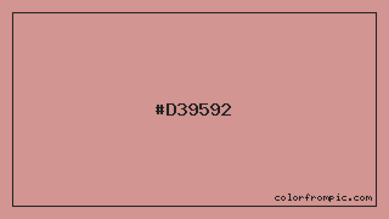 This color works well in various design contexts. With its medium lightness, it's versatile enough for both foreground elements and subtle backgrounds. The moderate to low saturation gives this color a sophisticated, muted quality that works well in professional and minimalist designs. When pairing #D39592 with other colors, consider its complementary color at hue 183° for maximum contrast, or use analogous colors within 30° of its hue for harmonious combinations. The decimal representation of this color is 13866386, which can be useful in certain programming contexts.