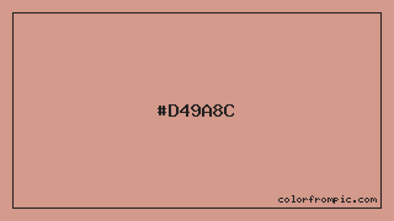 For print applications using the CMYK color model, #D49A8C would be reproduced using 0% cyan, 27% magenta, 34% yellow, and 17% black. The closest web-safe color is #CC9999, which may be useful for ensuring compatibility across older displays and systems.