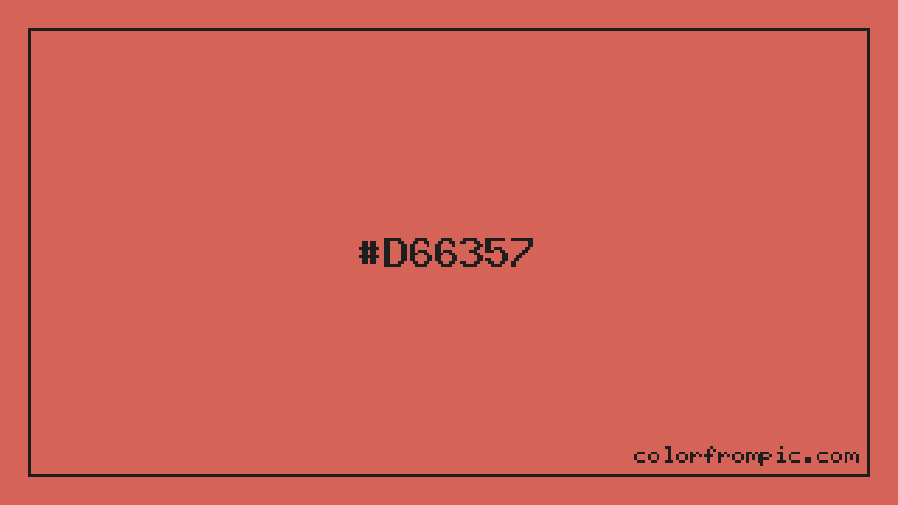 The hexadecimal color code #D66357 represents a medium shade in the red family. In the RGB color model, this color is composed of 214 red, 99 green, and 87 blue, which translates to approximately 84% red, 39% green, and 34% blue. This makes it a moderately saturated color with warm undertones that can evoke different emotional responses depending on its application.